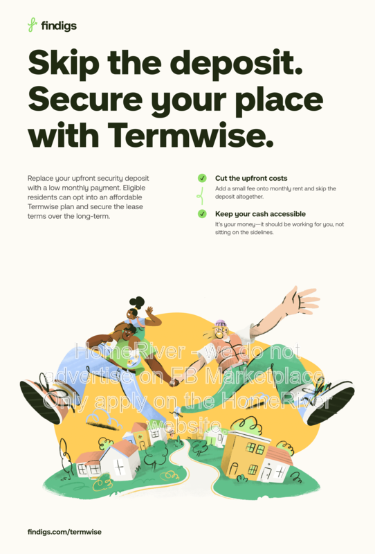 HomeRiver Group has partnered with Termwise to offer an affordable alternative to an upfront cash security deposit. Eligible residents can choose between paying an upfront security deposit or replacing it with an affordable Termwise monthly security deposit waiver fee. For more information, ask your leasing agent or visit https://www.findigs.com/blog/skip-the-deposit-with-termwise-a-new-way-to-secure-your-rental.