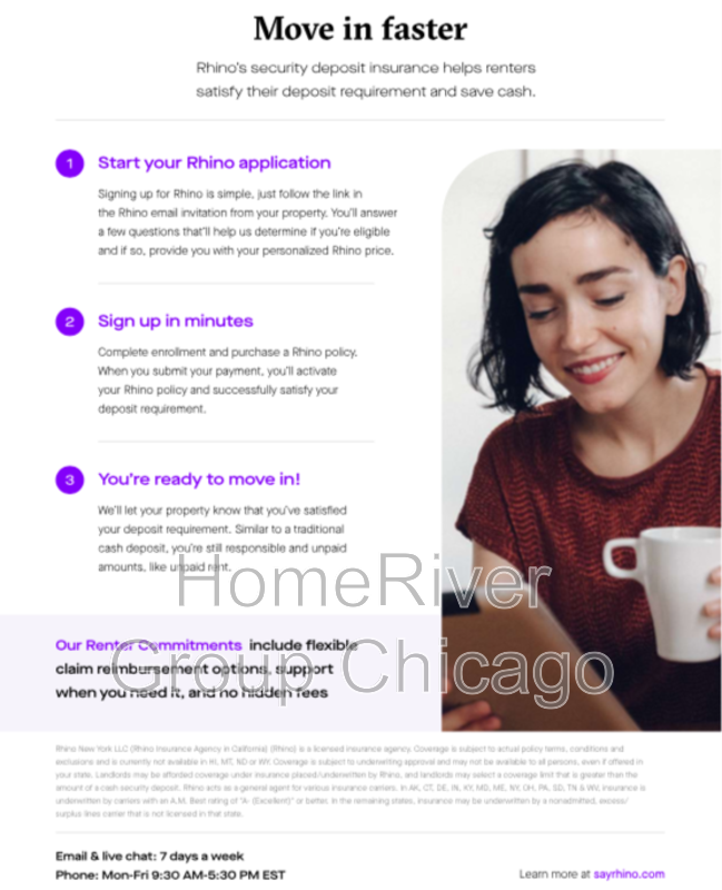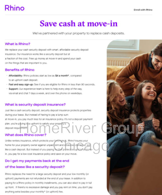 HomeRiver Group has partnered with Rhino to offer an affordable alternative to upfront cash security deposits. Approved residents can choose between paying a security deposit equal to one (1) months rent OR purchase a deposit replacement policy with Rhino at a fraction of the upfront cost. More information can be provided upon request.